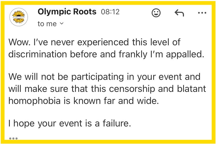 “Wow. I’ve never experienced this level of discrimination before and frankly I’m appalled. We will not be participating in your event and will make sure that this censorship and blatant homophobia is known far and wide. I hope your event is a failure.”