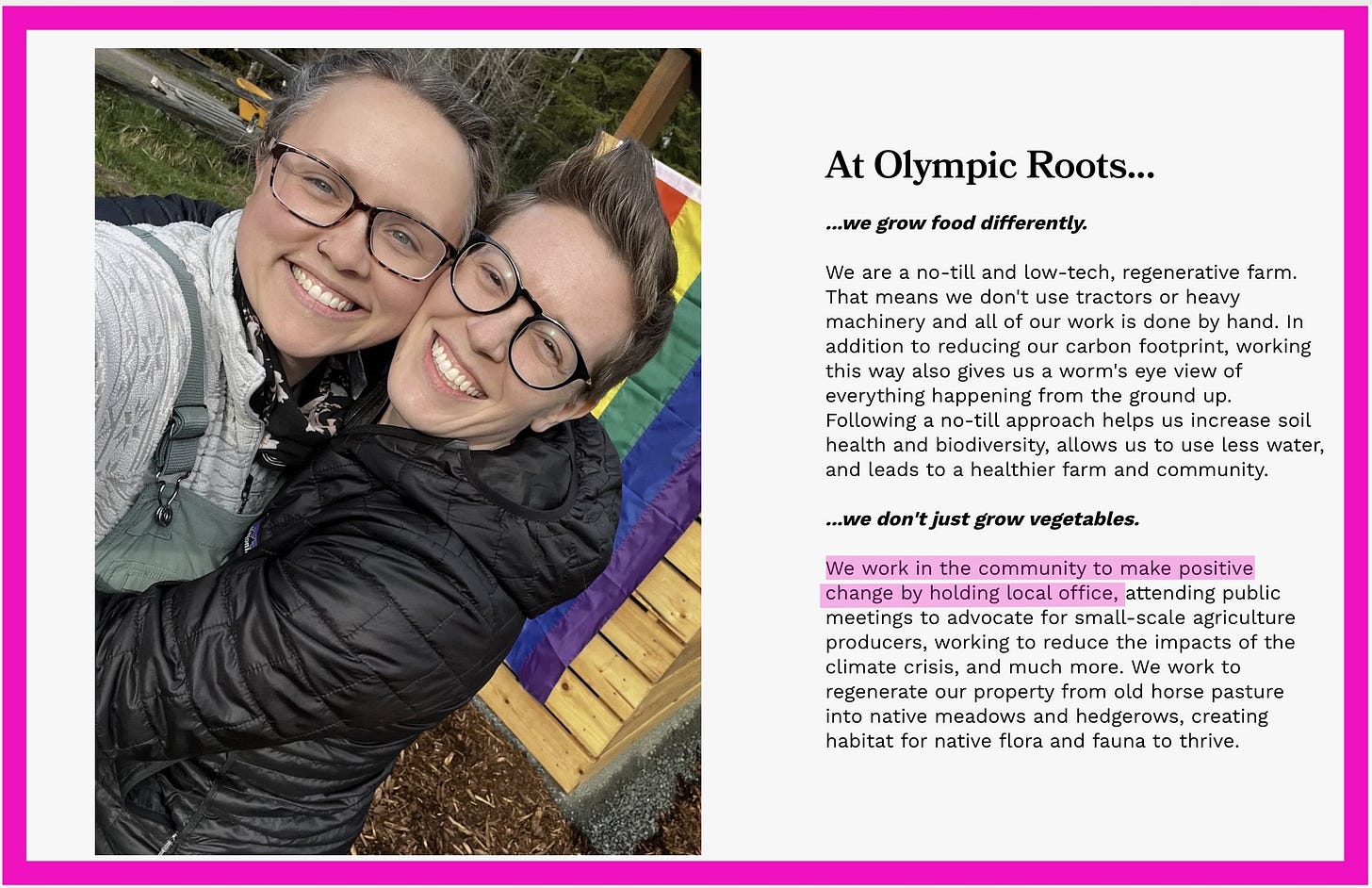 The CCD markets itself as a bridge-builder — an organization that helps farms thrive, strengthens communities, and promotes conservation. Cox’s personal farm, Olympic Roots, even claims to embody those values: “We don’t just grow vegetables. We work in the community to make positive change by holding local office.”