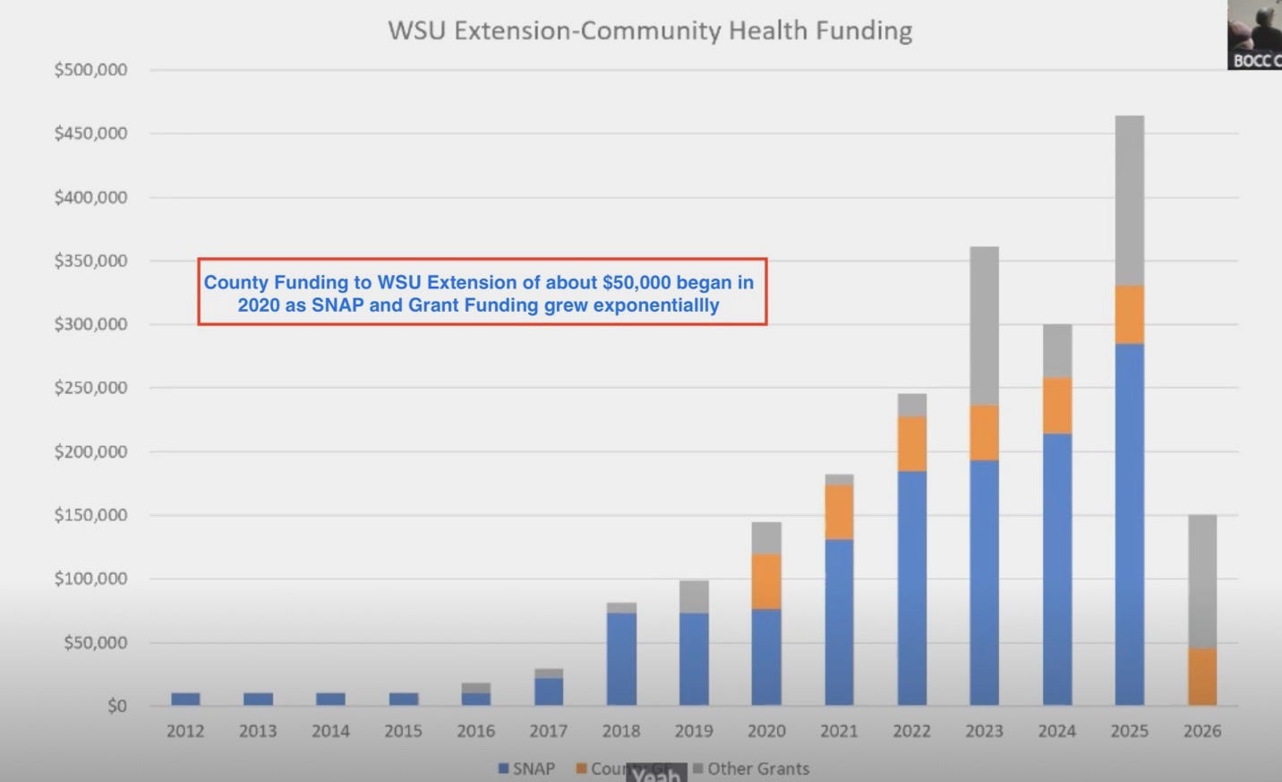 For example, the county continues funding WSU Extension at roughly $50,000 annually, even as grant sources like SNAP diminish. Rather than reduce spending, the county plans to offset the gap with $54,000 in additional fees in 2026.