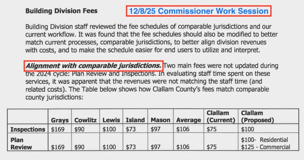 The commissioners, DCD, and Environmental Health often justify fee increases by benchmarking against other counties.