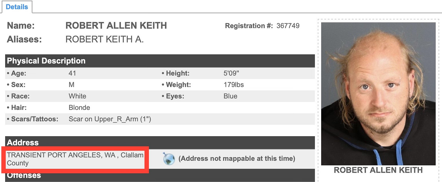 According to the Washington State sex offender registry, Robert Allen Keith, 41, is listed as a transient in Port Angeles.