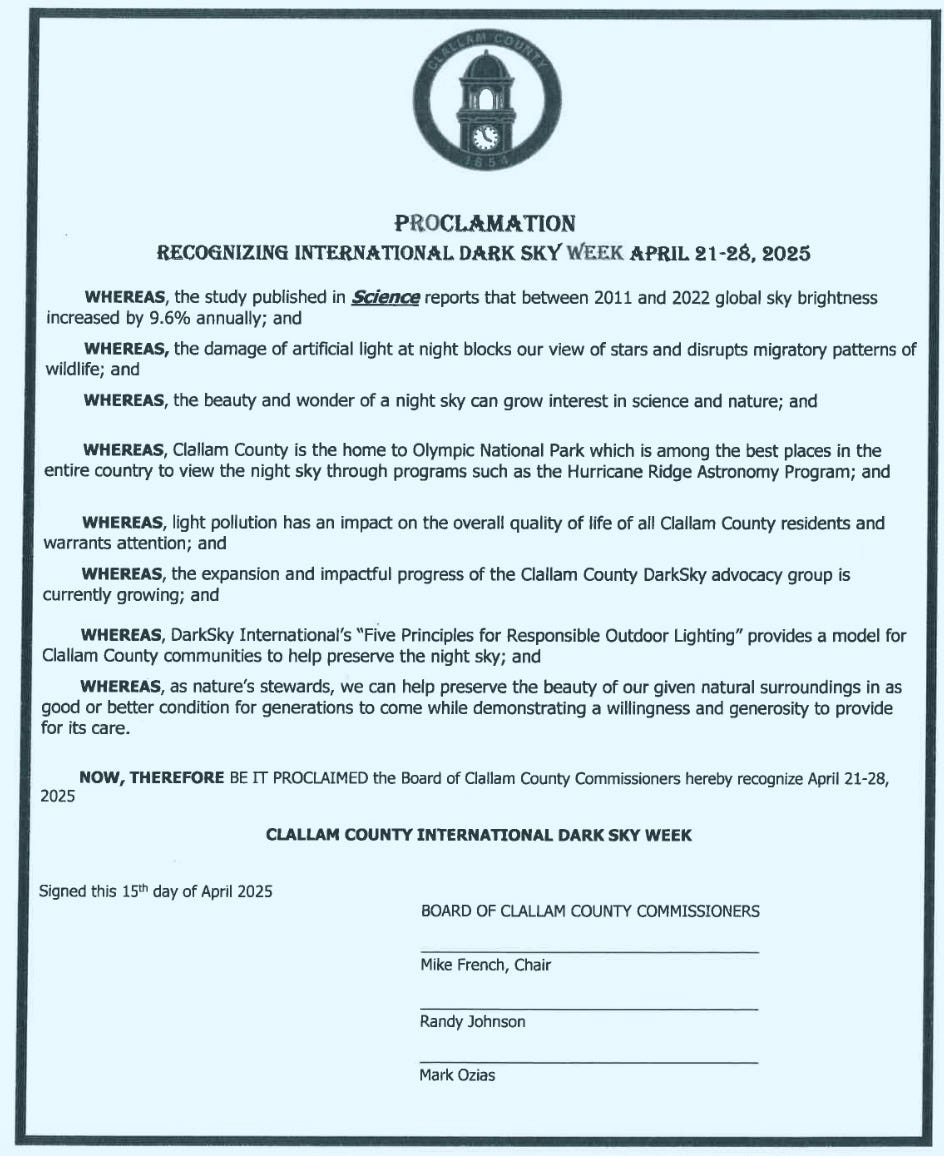 Each year, the commissioners issue a proclamation recognizing International Dark Sky Week, warning about the harms of artificial light.