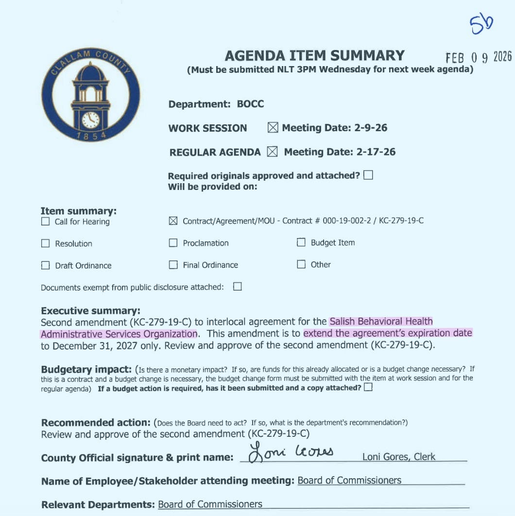 Next week, commissioners will vote on extending an agreement with Salish Behavioral Health Administrative Services Organization, the regional entity responsible for administering state behavioral-health funds.