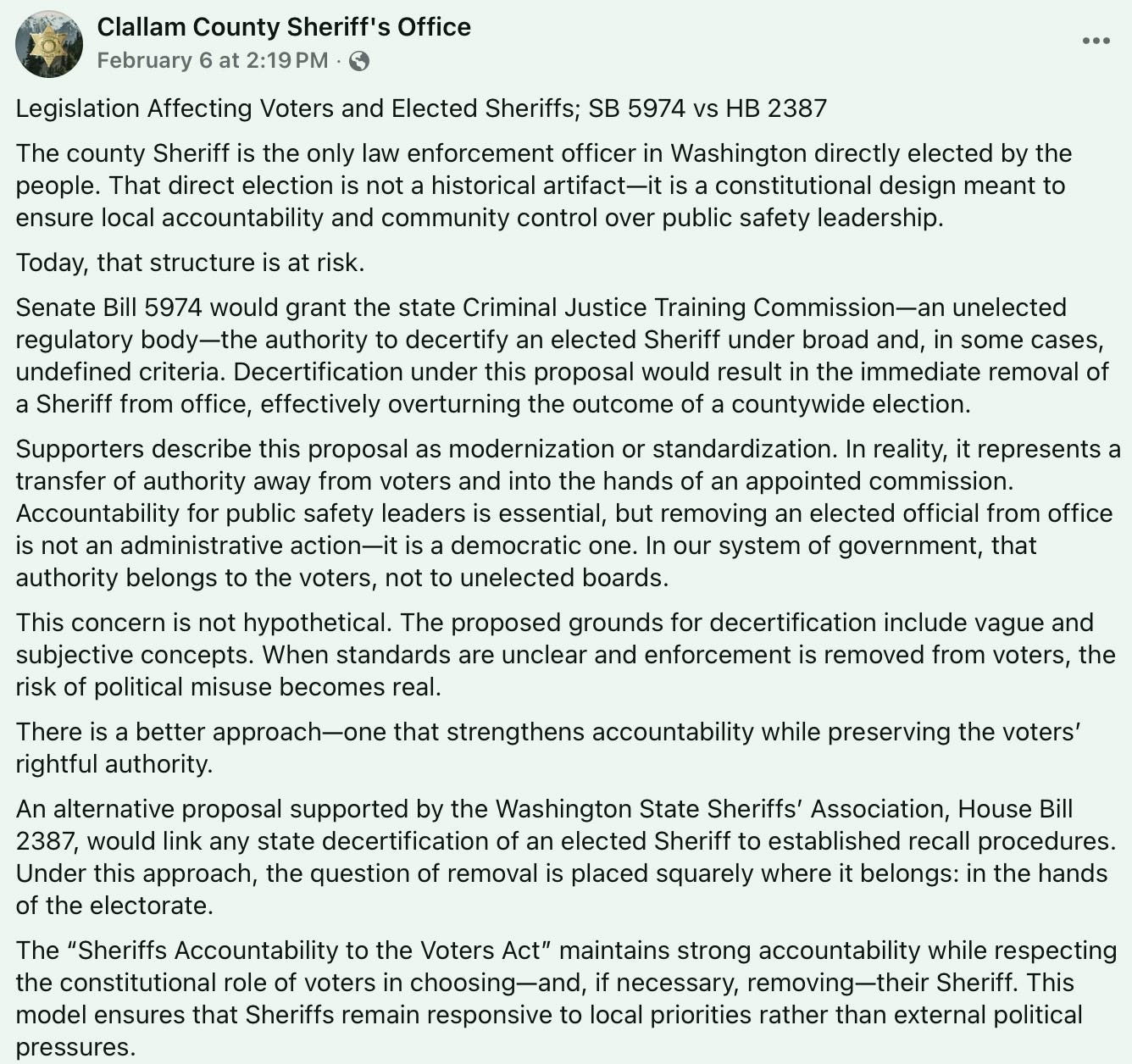 There is a better bill—HB 2387, backed by the Washington State Sheriffs’ Association—that ties any decertification to the existing recall process, keeping the ultimate decision with voters where it belongs.