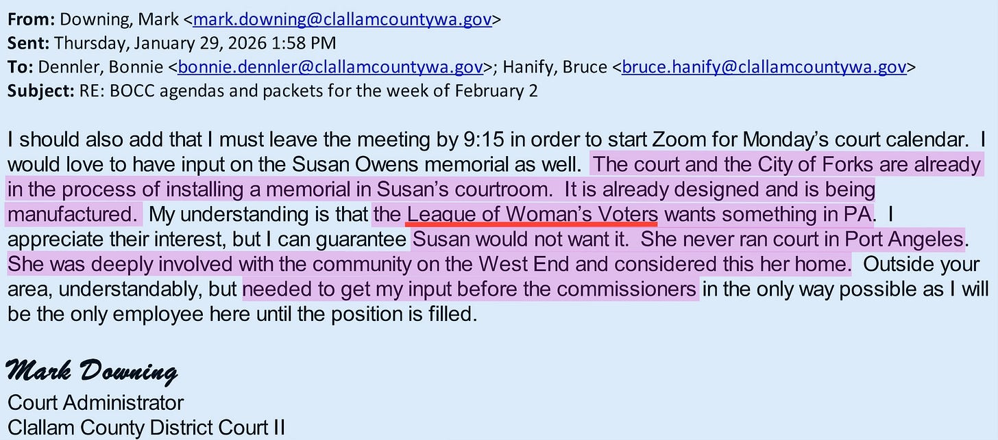 Four days before Commissioner French invited hand-picked “stakeholders” into a courthouse-renaming work session, the District Court administrator in Forks sent a blunt email stating—clearly and unequivocally—that Justice Susan Owens would not have wanted the Clallam County Courthouse renamed after her.