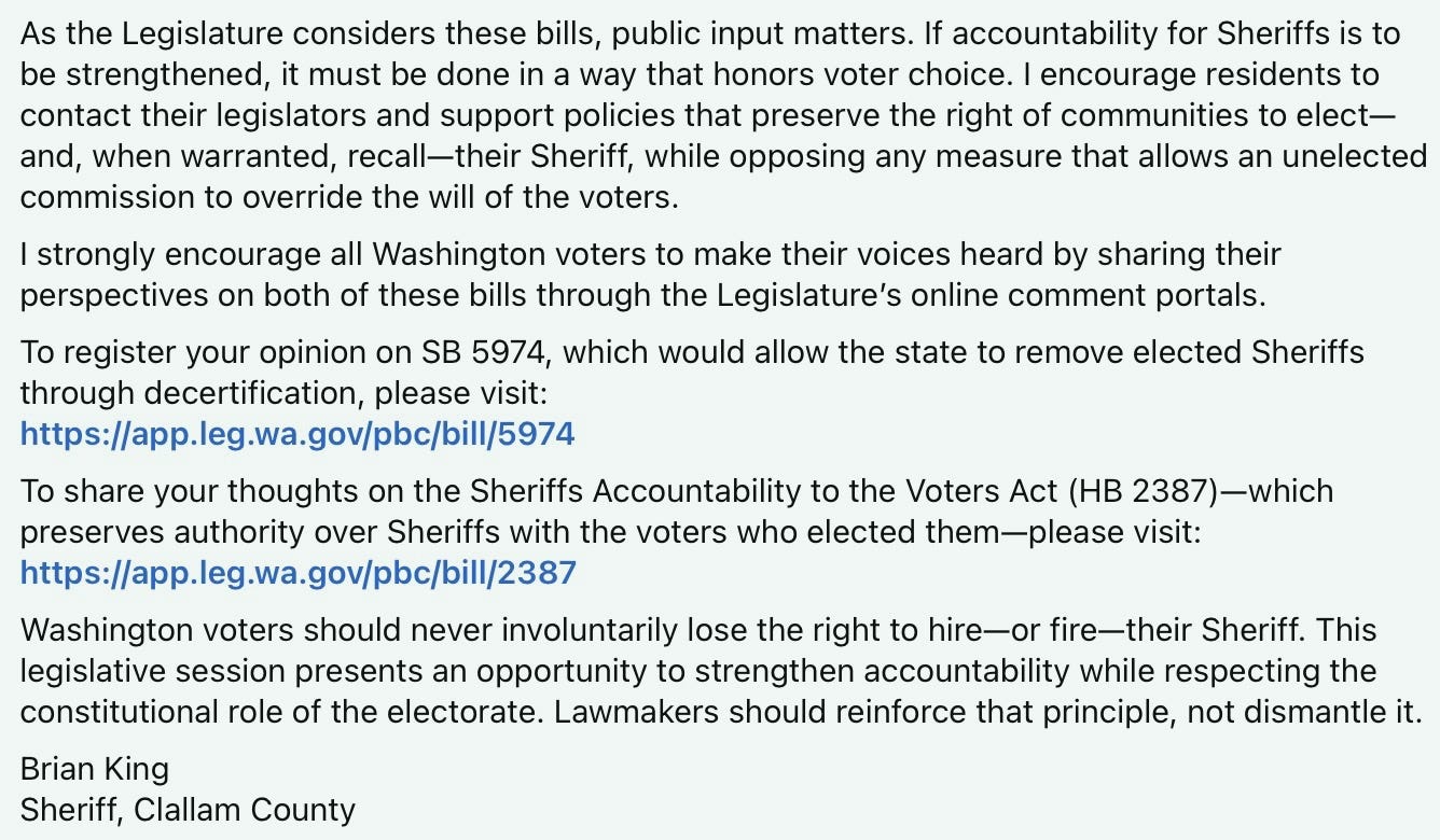Clallam County Sheriff Brian King issued a rare public warning this week about legislation that strikes at the heart of local democracy.