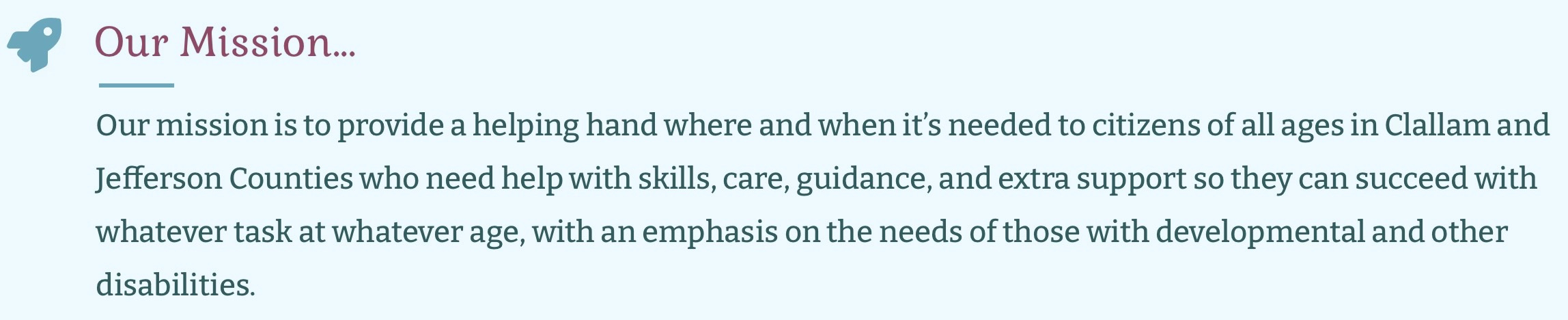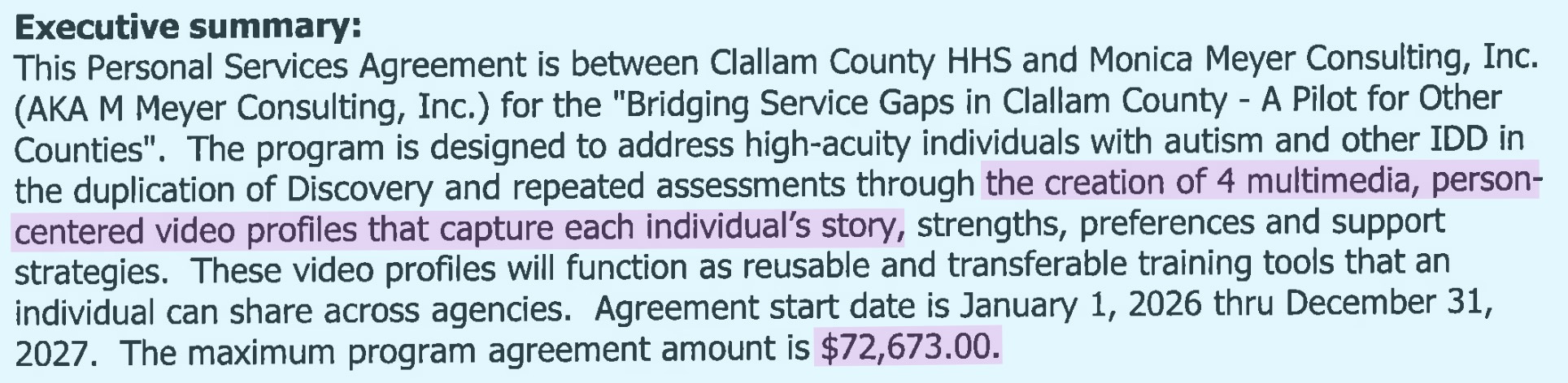 I found it interesting the first time I heard of the making of these videos. Something wasn't right. My son is 40 years old with special needs. He has worked at many jobs over the years. Never once were we, his parents, allowed nor asked for input on what was best for him! Never had to tell his story once. So who is really saved from having to repeat this? Still not sure. Second comment, every year for many years, my son came home from Clallam Mosaic classes with a great big rolling duffle bag full of emergency preparedness items. I believe they had guest speakers for the day that brought them. But I asked to not be given them anymore because they were taking up so much space in his closet. One was enough anyway, thank you. No record of who had already received this? Now I'm beginning to understand, it's all about the money (as usual) and how to keep it coming to an organization even if not really needed for intended purpose anymore. Sad and such a waste.