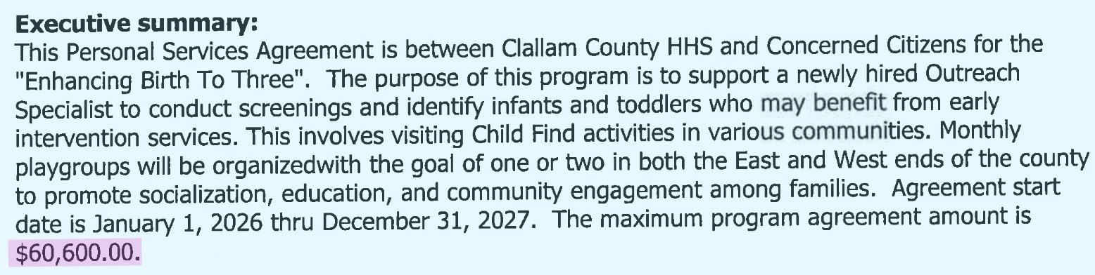 2. $60,600 to “Concerned Citizens” for infant/toddler screening and monthly playgroups