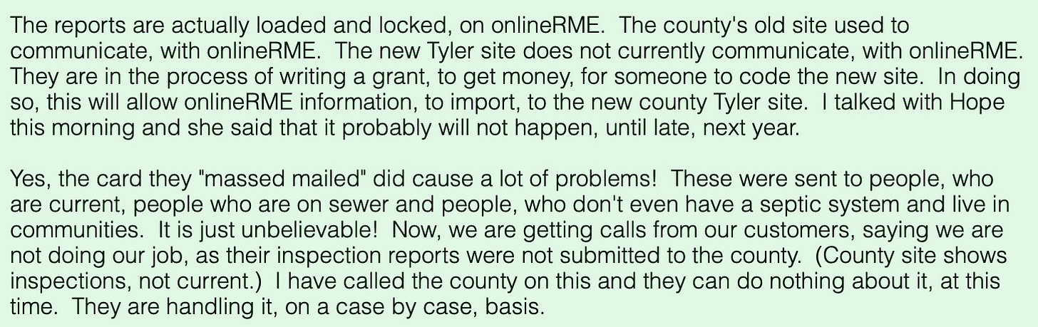 One resident recently contacted their septic inspection company after receiving a county card suggesting their inspections were not up to date. The company assured them that inspections had indeed been submitted — but revealed something startling.