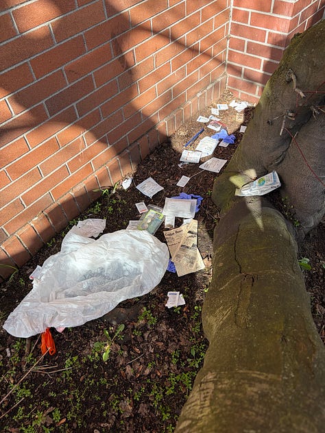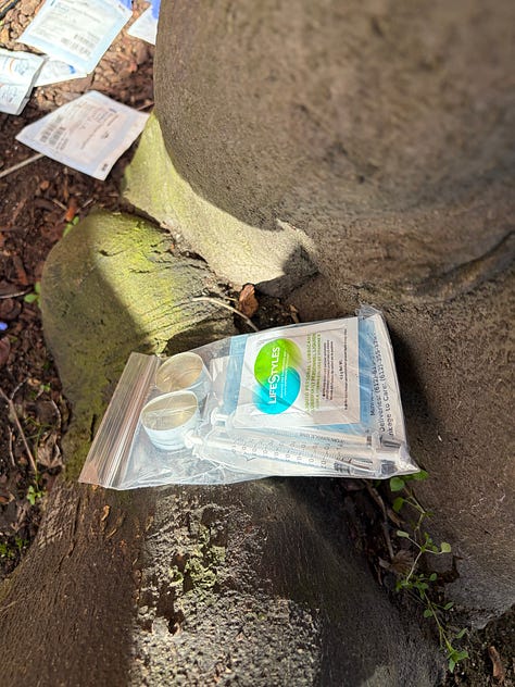Photos taken shortly afterward show where the man may have been staying — tucked into the alcove of a nearby business that is now left to deal with the aftermath. Scattered across the ground were condoms, gauze, a tourniquet, sponges, syringes, and other debris.