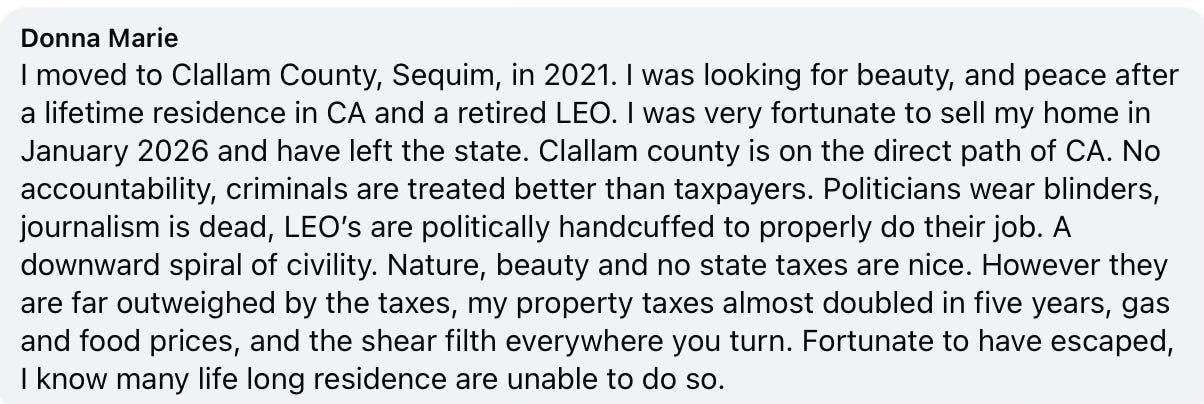 It has become harder for those who remain in Clallam County to argue with friends and neighbors who have chosen to leave.