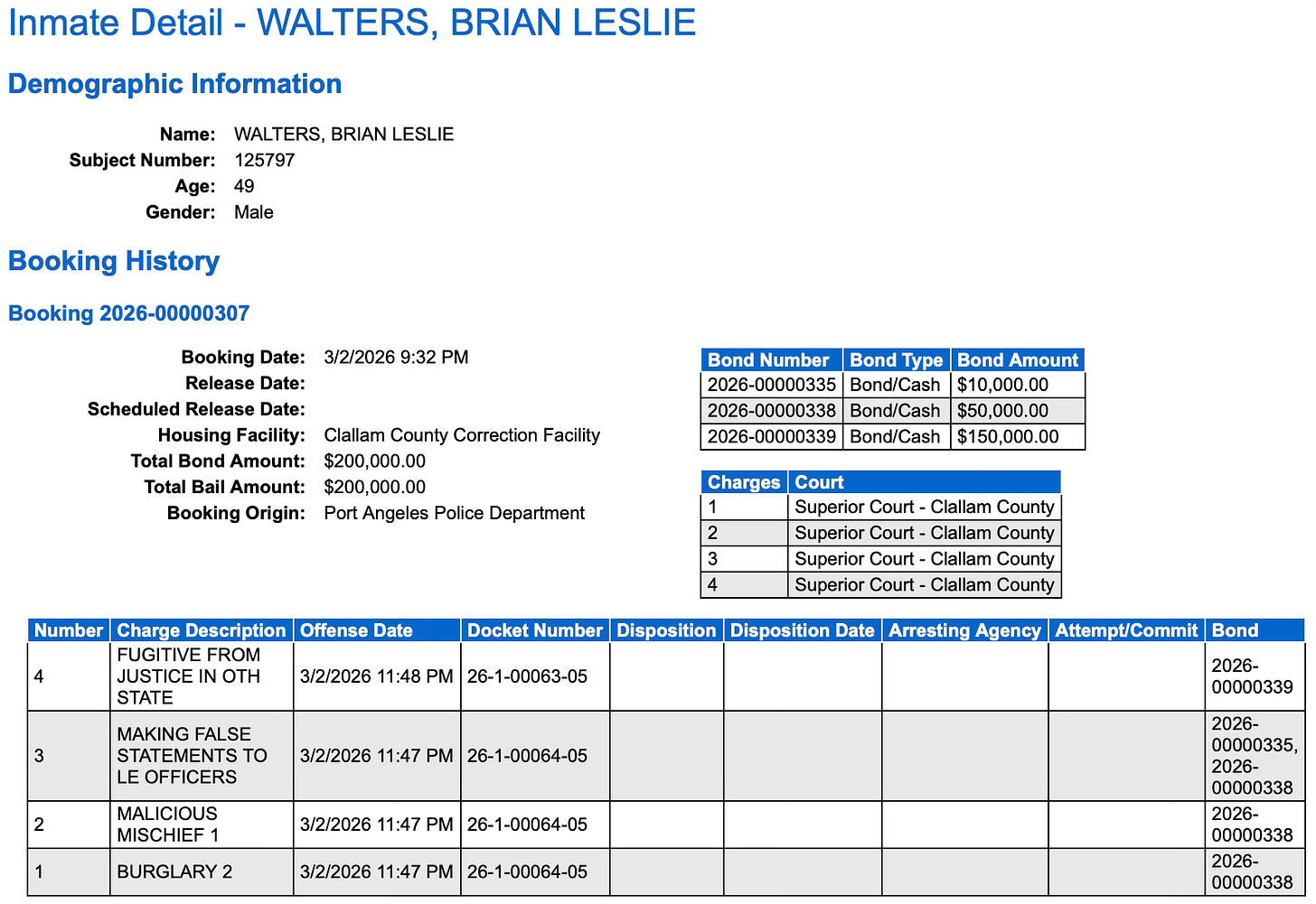 On Monday, 49-year-old Brian Leslie Walters was arrested in Clallam County as a fugitive from justice. He faces charges including making false statements, malicious mischief, and burglary.