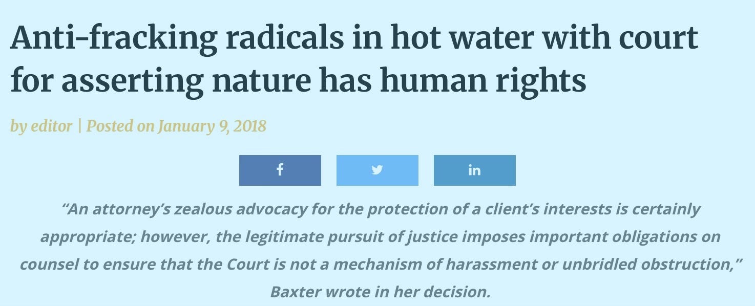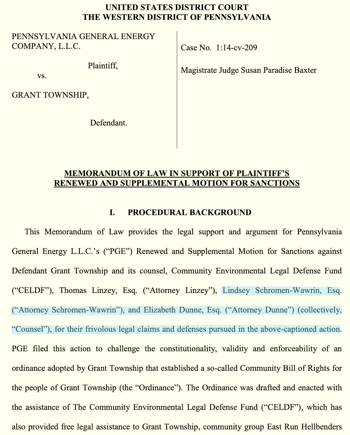 In 2018, a federal judge fined CELDF attorneys $52,000 for filing frivolous and repetitive claims. Dunne was named in the sanction order. Schromen-Wawrin was part of the same legal team.